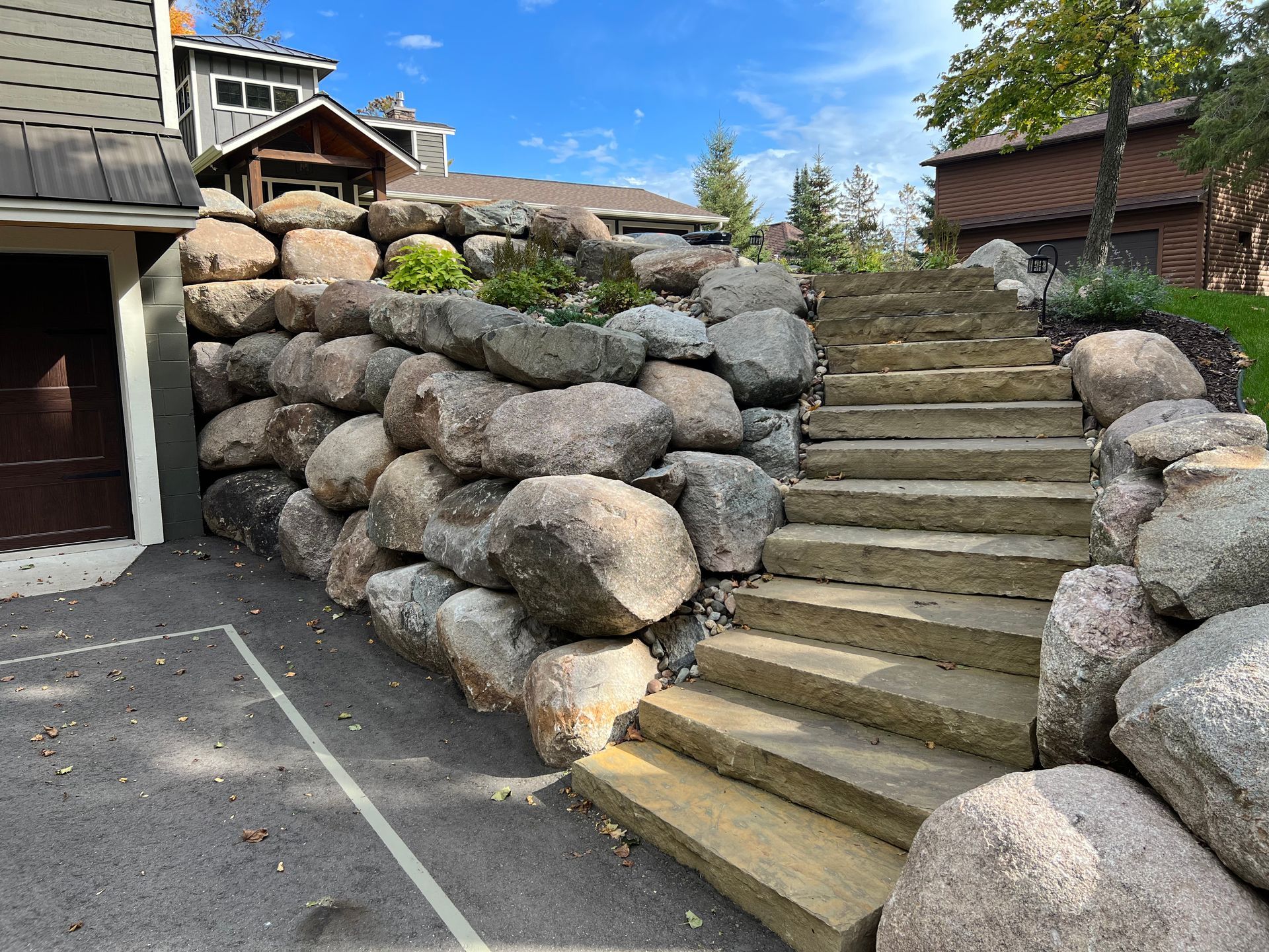 CJ's Landscaping has done three retaining walls, steps down to the lake, and a gorgeous paver patio for us. His results are amazing and done on time. In addition, his rates are affordable. Our wooden retaining wall was falling down. The boulder wall took two days and has added an up north look to our front yard. CJ also does our snow plowing and his work is so much better than our previous plow drivers.